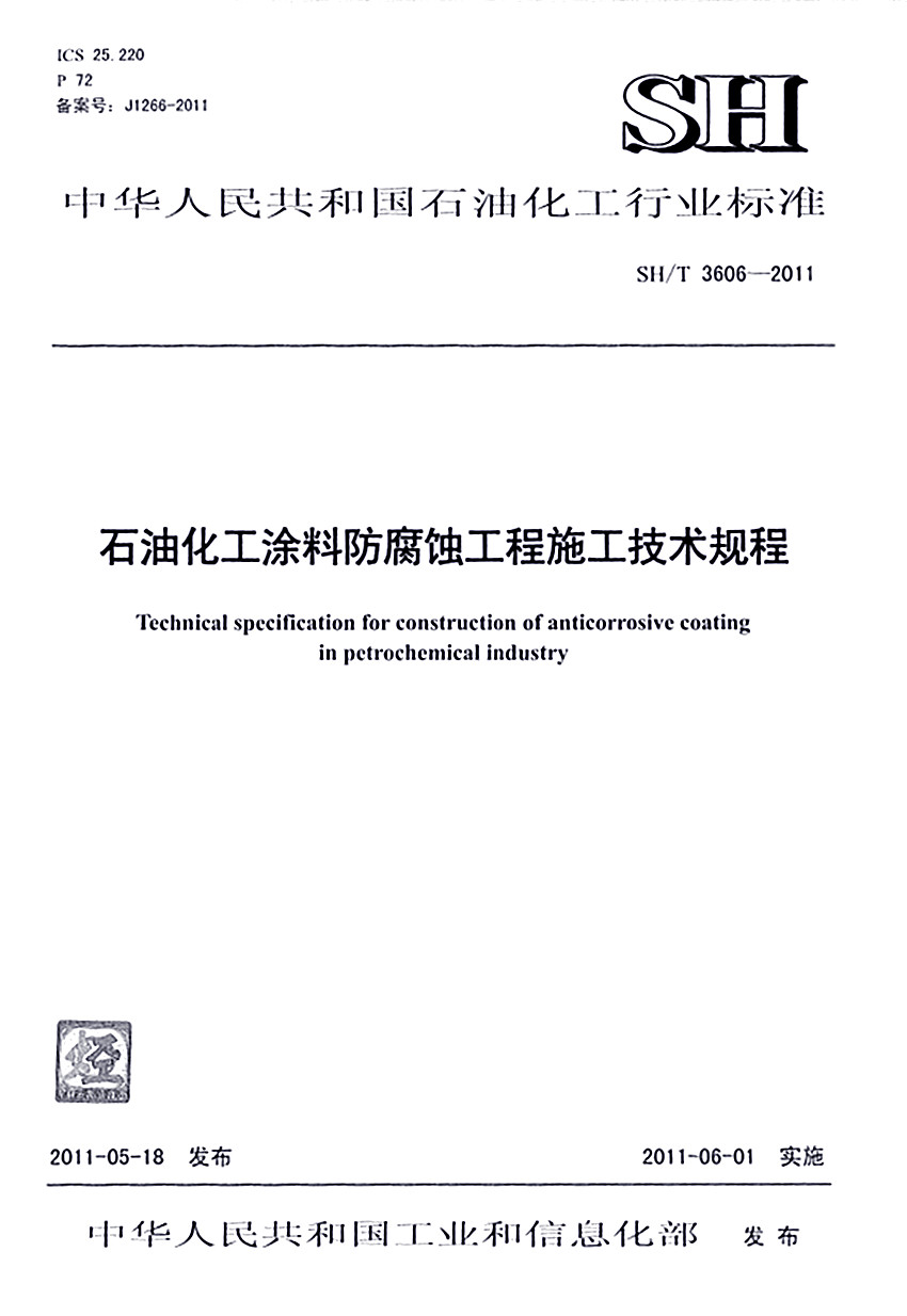 石油化工涂料防腐蝕工程施工技術(shù)規(guī)程標(biāo)準(zhǔn)SH/T 3606-2011 ICS25.220 P72 備案號:J1266-2011 SH 中華人民共和國石油化工行業(yè)標(biāo)準(zhǔn) SH/T 3606-2011石油化工涂料防腐蝕工程施工技術(shù)規(guī)程 Technical spccificatinon for construction of anticorrosive coating in pctrochcmical in